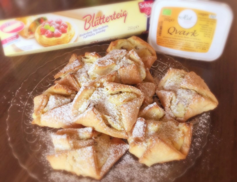 Da es nun endlich veganen Topfen (Quark) zu kaufen gibt, habe ich mich heute an der Herstellung von Topfentascherl versucht. Und es hat funktioniert! Zuerst habe ich es mir leicht gemacht und einfach den fertigen glutenfreien Blätterteig von Schär® verwendet. Der ist leider sehr porös und bricht leicht. Deswegen schauen die Topfentascherln auch etwas „mitgenommen“ aus. Außerdem enthält er Soja, was nicht jeder essen kann. Also habe ich dann selbst einen Teig gemacht. Der ist besser zu verarbeiten, allerdings erfordert die Herstellung eventuell ein bisschen Routine im Umgang mit glutenfreien Teigen. Fazit: beide Varianten haben uns wunderbar geschmeckt.