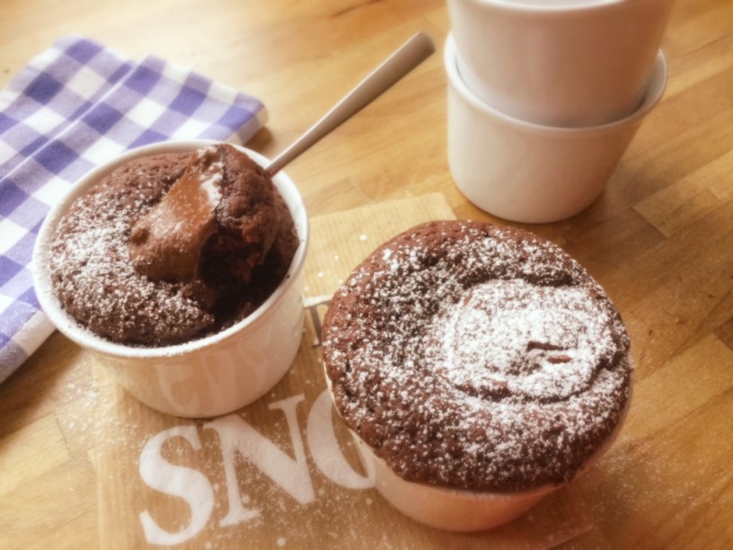 Alle Zutaten (außer Nougatcreme) mit dem Schneebesen (oder einem Löffel) zu einem Teig verrühren. Zwei Keramikförmchen zu 2/3 mit Teig befüllen und in der Mitte zwei Esslöffel Nougatcreme setzen und einsinken lassen.