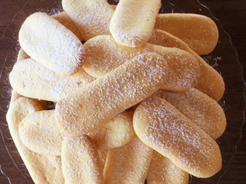 Die Masse in einen Spritzbeutel mit großer Lochtülle füllen und auf ein mit Backpapier ausgelegtes Backblech längliche Biskotten spritzen. Ich habe eine eigene im Fachhandel erhältliche Backform für Biskotten (Löffelbiskuits) verwendet. Das ist aber nicht unbedingt notwendig.
