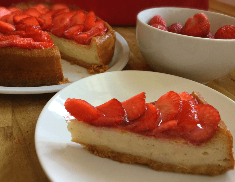 Wenn der Kuchen abgekühlt ist, Erdbeeren waschen, Stiele entfernen, in Scheiben schneiden und in Schichten auf den Kuchen verteilen. Das Tortengelee nach Anleitung auf der Packung kochen und über die Erdbeeren gießen.