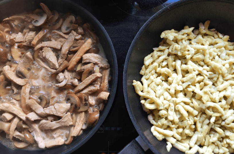 Aus allen Zutaten mit dem Mixer zu einem glatten Teig rühren. Der Teig sollte zäh vom Löffel fallen, damit er dann auch durch die Löcher der Spätzlepresse läuft. Allerdings sollte er auf keinen Fall dünnflüssig sein.