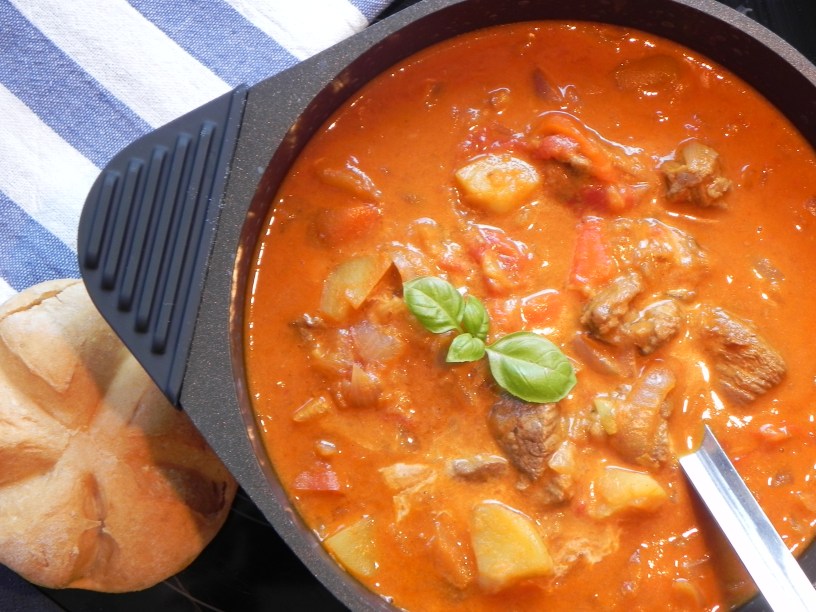 Dazu passen Nudeln, Knödel, Kartoffel oder (wie auf dem Bild) eine glutenfreie Semmel (von Schär).