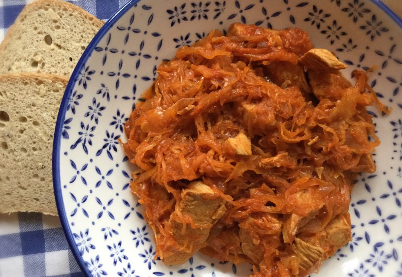 Üblicherweise wird Szegediner-Gulasch mit Schweinefleisch zubereitet. Da ich Schweinefleisch generell ablehne und auch nur Fleisch aus streng biologischer Herkunft verwende, nehme ich vorzugsweise Huhn oder Pute aus der Region.