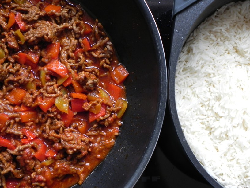 Entweder Reis und Sauce vermischen oder den Reis auf einen Teller geben und die Sauce darum verteilen.