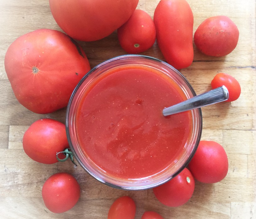 Tomaten, Knoblauchpulver, Tomatenmark, Senfpulver (wer Senfkörner verwendet sollte diese vorher mahlen oder im Mörser zerreiben) und Salz dazugeben.