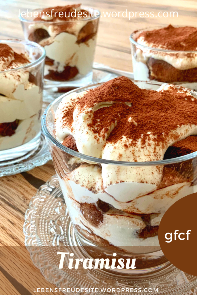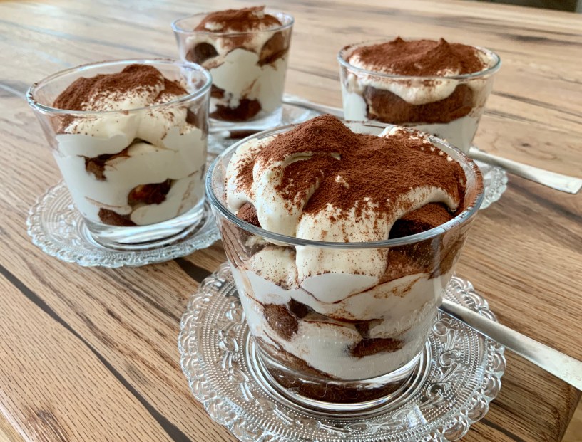 Ich habe mein Tiramisu portionsweise in Gläsern mit einem Fassungsvermögen von je 250 ml zubereitet. Man kann es aber natürlich auch als ganzes in einer Keramik- oder Glasform zubereiten.