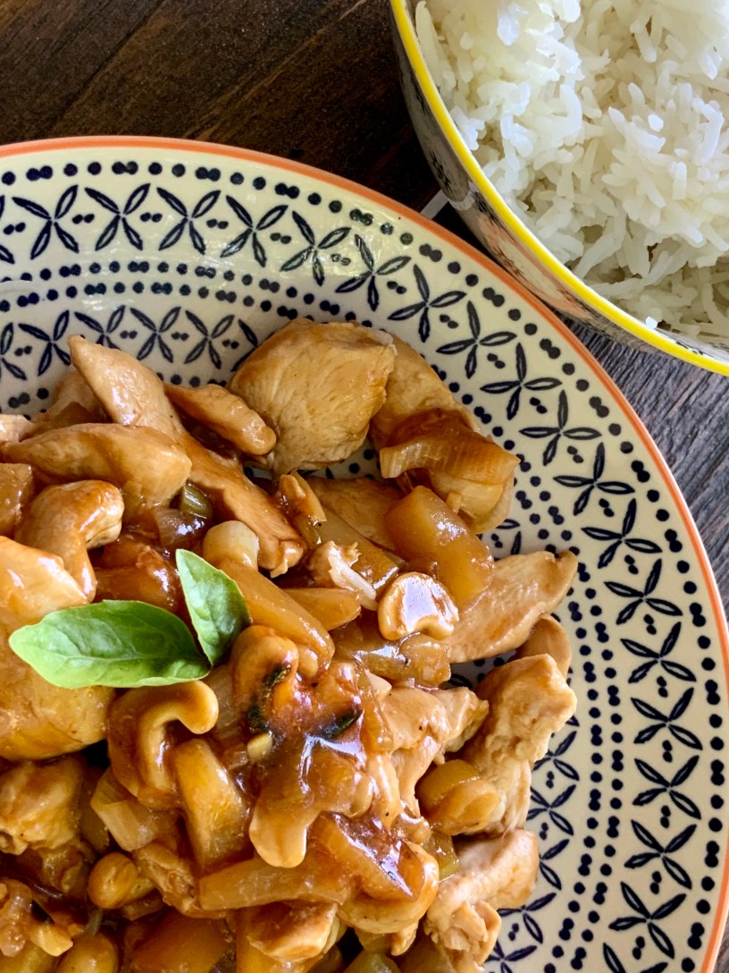 Knoblauch und Ingwer fein schneiden. Jungzwiebel in Ringe schneiden. Hühnerfilets in Streifen schneiden. Ananas abtropfen lassen.