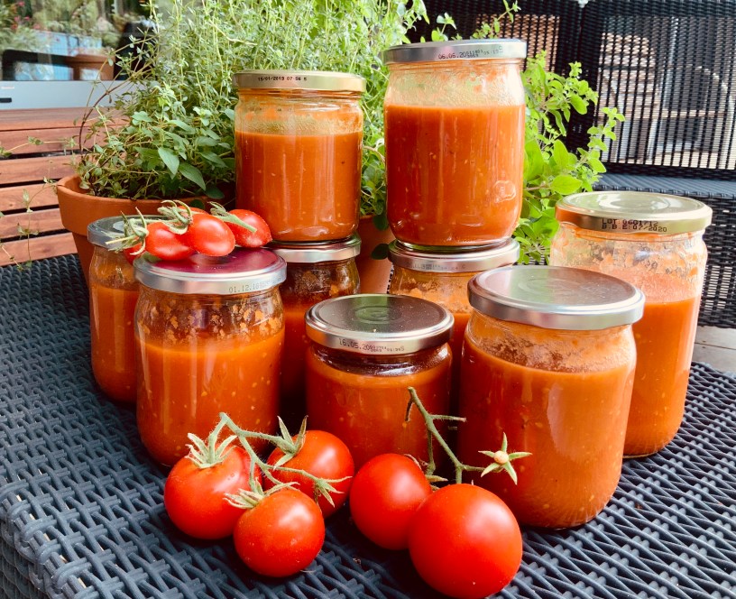 Das eingekochte Tomatensugo soll kühl und dunkel gelagert werden, dann hält es sich einige Monate.