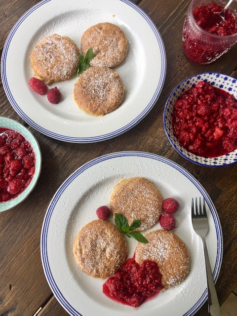 Himbeeren mit Zucker und Vanille erhitzen und zu den Polenta-Talern essen. Wer die kleinen Kerne der Himbeeren nicht mag, kann die fertig gekochte Himbeermasse fein pürieren.