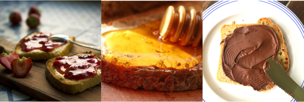 Brot, Brötchen oder Toast mit Margarine, Marmelade, Honig oder Haselnusscreme