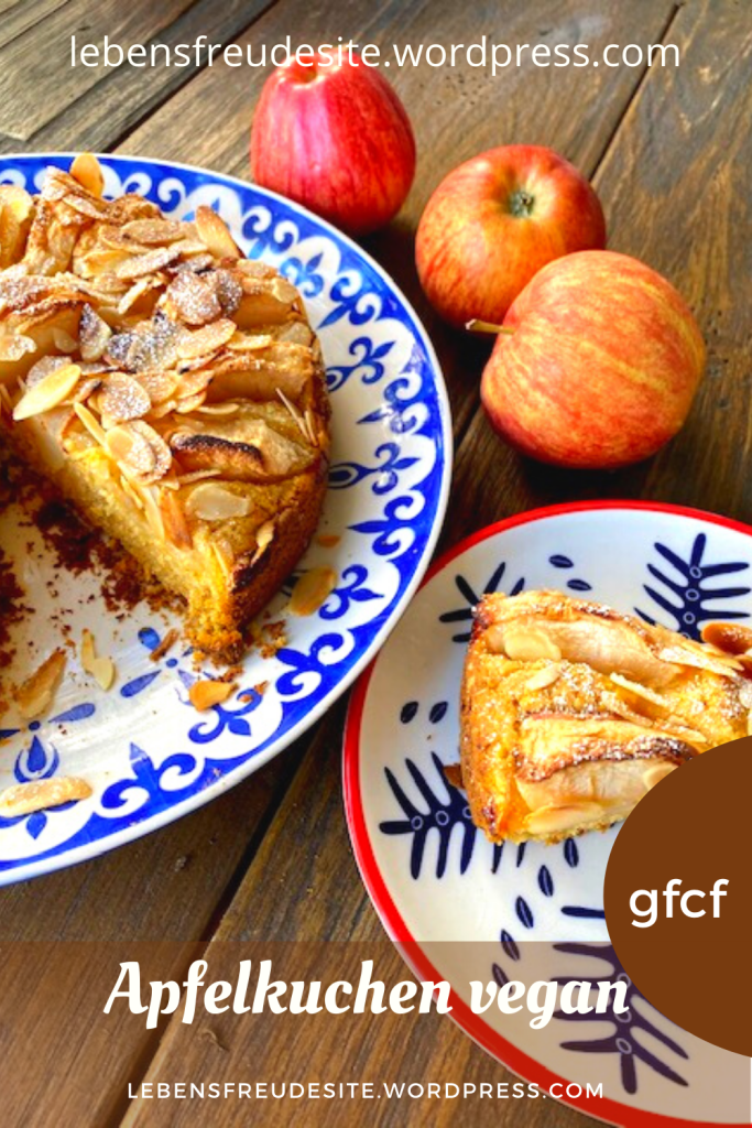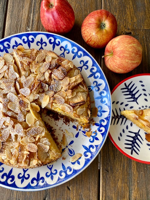 Die Äpfel schälen, Kerngehäuse entfernen und achteln. Die Apfelteile mit der runden Seite nach oben in den Teig drücken und Mandelblättchen drüberstreuen.