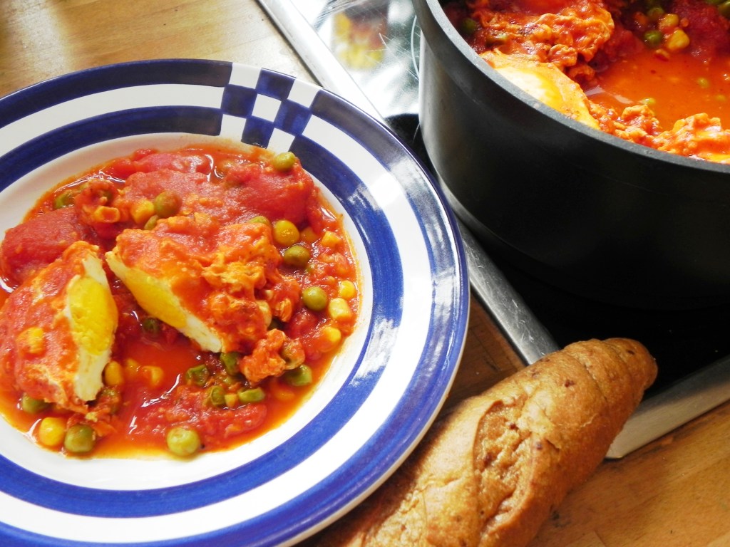 Knoblauch pressen und in Olivenöl kurz anbraten. Die geschälten Tomaten zugeben und zugedeckt ca. 20 min. köcheln lassen. Nun die Erbsen und den Mais dazugeben, mit Salz, Pfeffer, Oregano und Rosmarin würzen und weitere 10 min. köcheln. Nun vorsichtig die Eier aufschlagen und in den Topf gleiten lassen. Nicht mehr umrühren! Den Topf schließen und auf schwacher Temperatur nochmals 10 min. ziehen lassen.