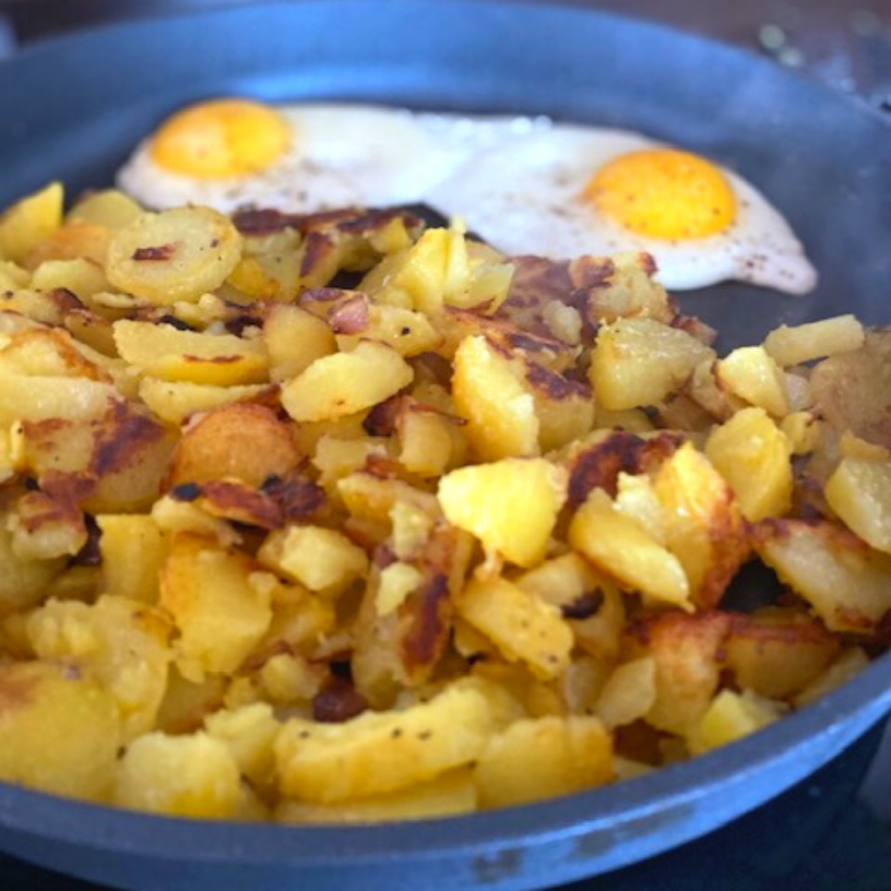 Dazu passt gut ein Spiegelei und eine Schüssel grüner Salat oder Spinat. Aber auch als Beilage für Würstchen oder Fleischgerichten geeignet.