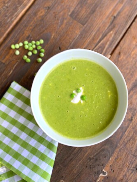 Zwiebel und Knoblauch klein schneiden und in der Margarine glasig andünsten. Mit Gemüsebrühe aufgießen, Erbsen dazugeben und zugedeckt bei schwacher Hitze ca. 20 min köcheln lassen