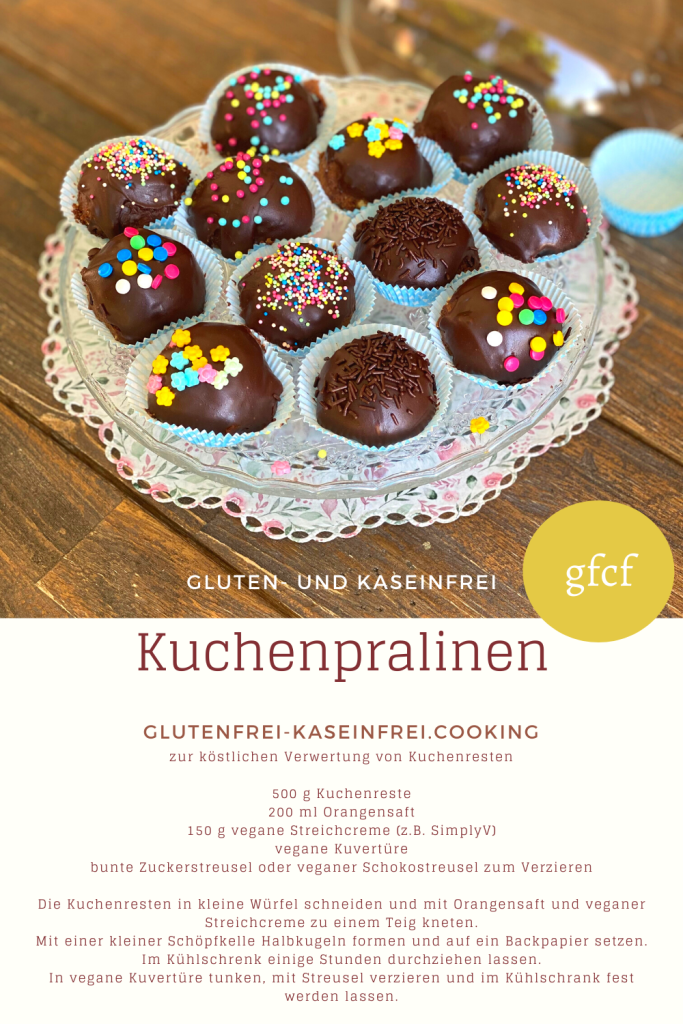 Die Kuchenresten in kleine Würfel schneiden und mit Orangensaft und veganer Streichcreme zu einem Teig kneten.