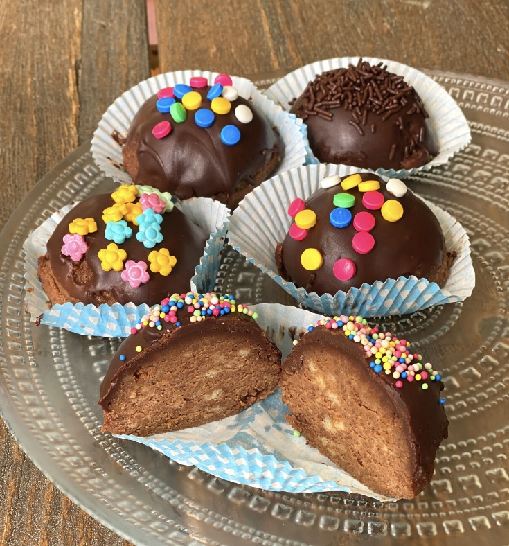 In vegane Kuvertüre tunken, mit Streusel verzieren und im Kühlschrank fest werden lassen.