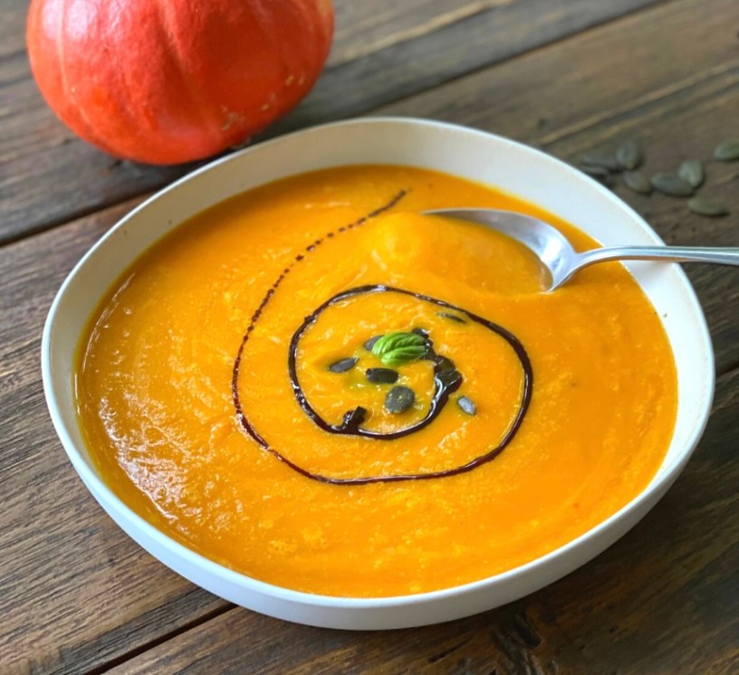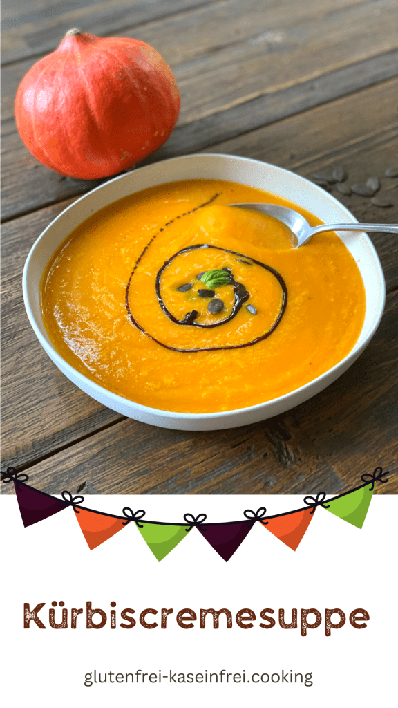 Anschließend mit dem Stabmixer die Suppe pürieren und gleichzeitig die vegane Schlagcreme (oder die kaseinfreie Crème fraîche) dazugeben. Nochmals abschmecken. Vor dem Servieren träufelt man noch ein wenig Kürbiskernöl über die Suppe.