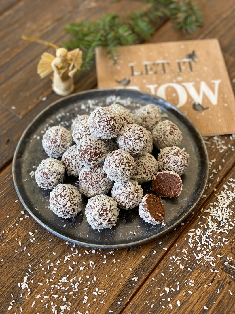 Kleine Kugeln formen, in Kokosraspel wälzen.