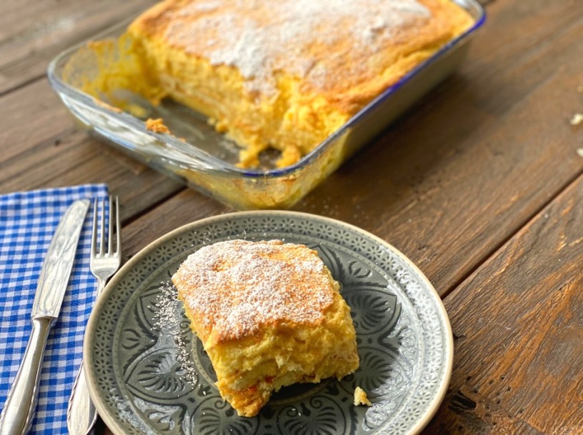 Inzwischen die 6 Eiweiß mit einer Prise Salz zu festem Eischnee schlagen. Backofen auf 180°C vorheizen. Den Eischnee vorsichtig unter die abgekühlte Creme heben. Die fertige Creme über die Biskotten gießen und im Backofen ca. 40 min. backen.