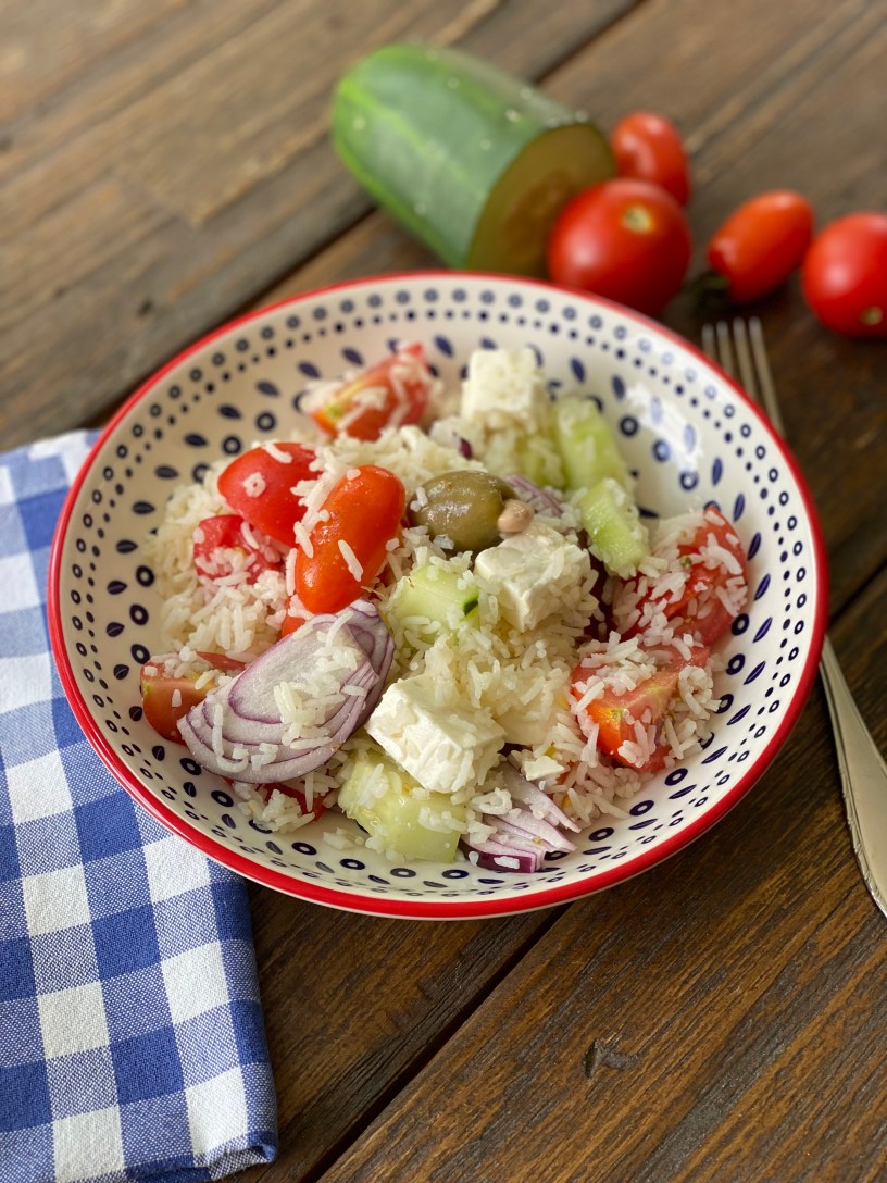Inzwischen Tomaten waschen und halbieren. Oliven grob hacken. Zwiebel in Ringe schneiden. Gurke waschen, längs halbieren, entkernen und würfeln. Den veganen Feta in Würfel schneiden.