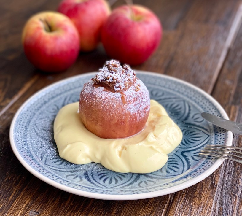 Nüsse (z. B. Walnüsse, Mandeln oder Haselnüsse), gemahlen oder gehackt, können mit etwas Marmelade verrührt und in die Öffnung der Äpfel gefüllt werden. Auch Mischungen mit kleinen Marzipanstückchen oder Rosinen schmecken hervorragend. Weihnachtlich wird es, wenn man noch etwas Zimt dazumischt. Lass deiner Fantasie ruhig freien Lauf!