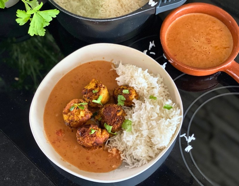 Die Linsenbällchen mit der Sauce übergießen und mit Reis servieren.